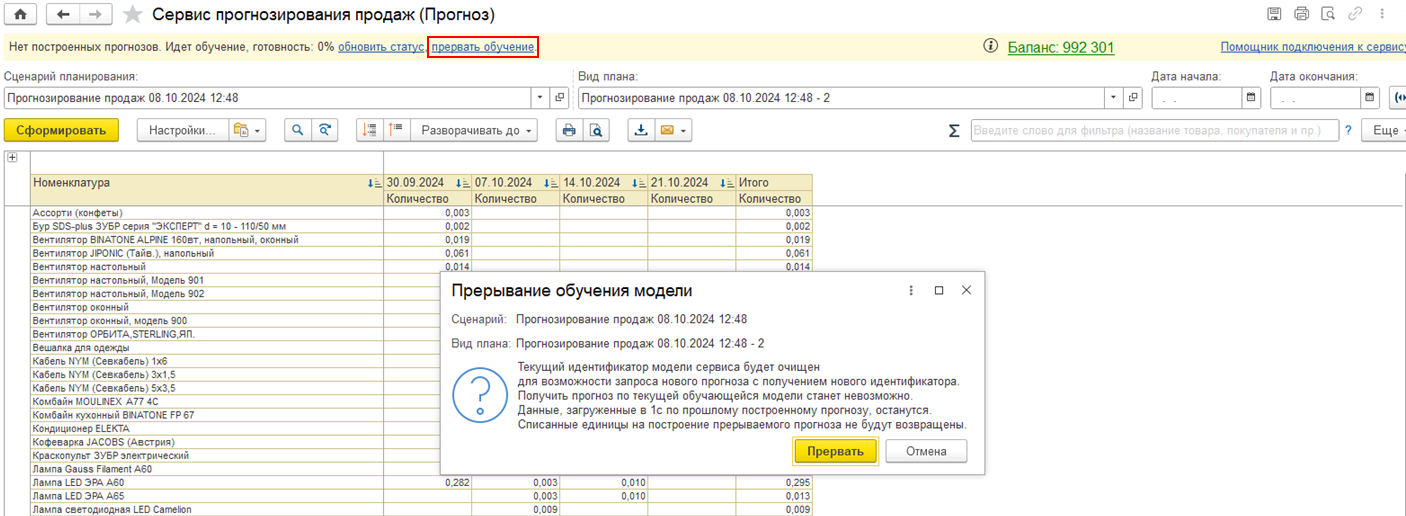 Предусмотрена возможность прервать текущее обучение модели прогнозирования продаж по команде прервать обучение. При применении команды будет выведена информация об особенностях прерывания обучения и предупреждение о том, что списанные единицы баланса не будут возвращены.