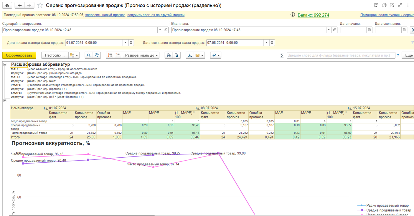Для контроля качества прогнозирования ранее был добавлен вариант отчета Прогноз с историей продаж (раздельно), который показывает фактические данные о продажах на дату. Этой информации оказалось недостаточно, потребовалось выводить информацию об оценке качества непосредственно в отчете: