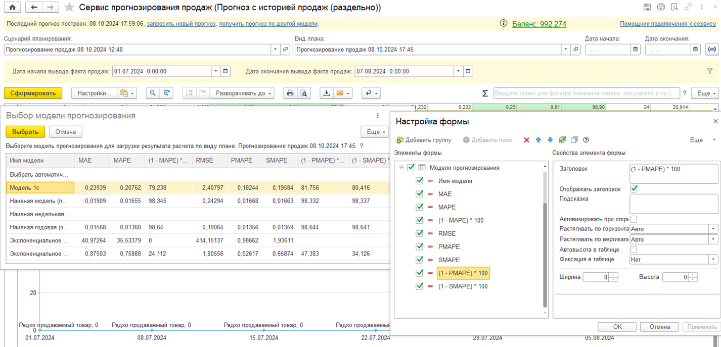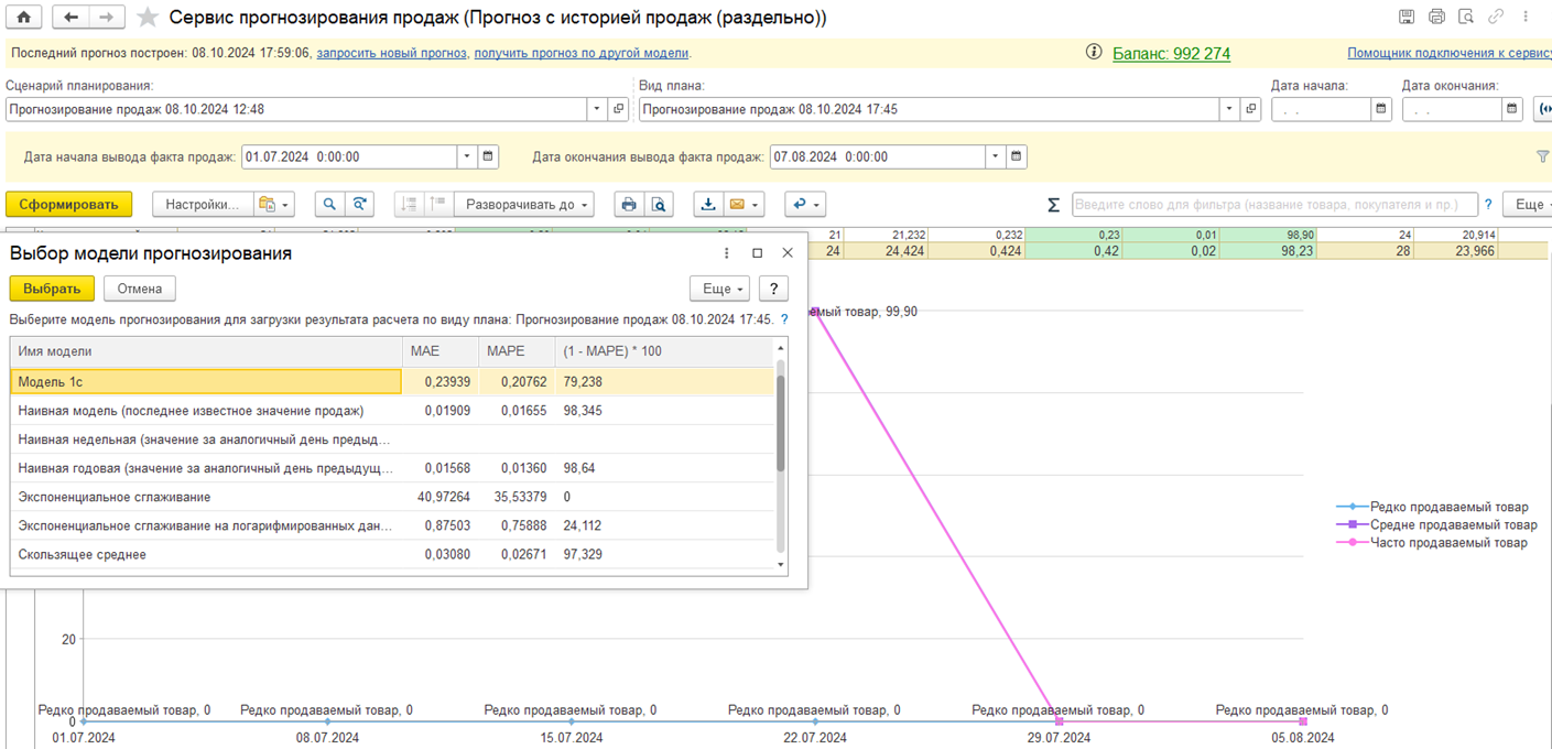 Ранее была реализована доработка, позволяющая получить результат прогноза по произвольной модели прогнозирования. Эта возможность связана с особенностями работы сервиса прогнозирования – одновременно рассчитываются сразу несколько моделей.
