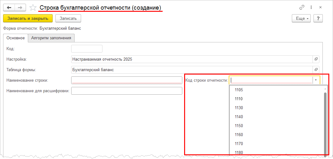 Коды новых основных строк бухгалтерского баланса и отчета о финансовых результатах должны соответствовать Приложению 10 к ФСБУ 4/2023, т.к. только их можно будет загрузить в ГИР БО. Поэтому при создании новой основной строки бухгалтерского баланса и отчета о финансовых результатах в поле Код строки отчетности предлагается выбор значения из фиксированного списка. Создавать иные коды строк отчетности не предполагается.