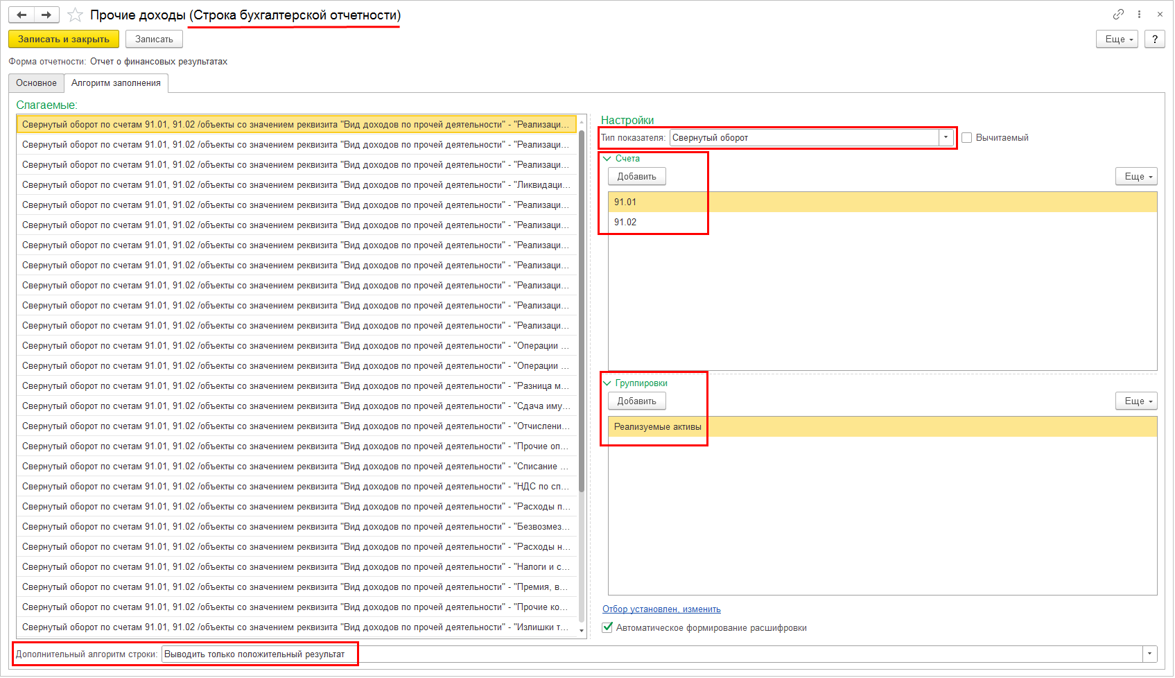 При выборе нового типа показателя «Свернутый оборот» в подобласти настройки Счета необходимо указать счета для сворачивания 91.01 «Прочие доходы» и 91.02 «Прочие расходы». В подобласти Группировки можно выбрать степень сворачивания оборотов по доходам и расходам (по каким субконто сворачивать обороты). Пустое значение группировки означает, что сворачивается оборот полностью по счетам (Дт 91.01 – Кт 91.02). В настройке Дополнительный алгоритм строки для строки доходов необходимо выбрать значение «Выводить только положительный результат», для строки расходов – «Выводить только отрицательный результат». Строки доходов и расходов парные. Поэтому при настройке алгоритмов, например, подстроки доходов, необходимо произвести аналогичные настройки и для её парной строки расходов с отличием только в значении настройки Дополнительный алгоритм строки.