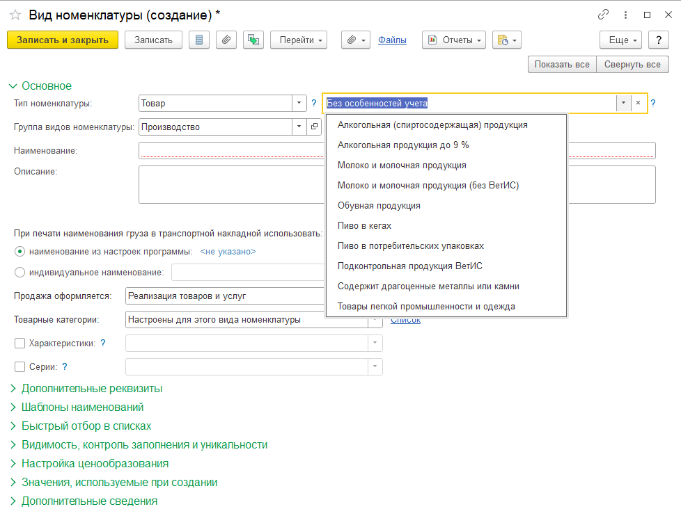 Тип номенклатуры и особенность учета выбираются в выпадающем списке.