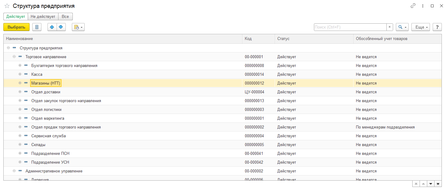 При выборе подразделения в списке выбора предусмотрен переключатель Действует / Не действует / Все, который позволяет установить отбор по статусу. Форма выбора по умолчанию открывается с быстрым отбором по статусу Действует.