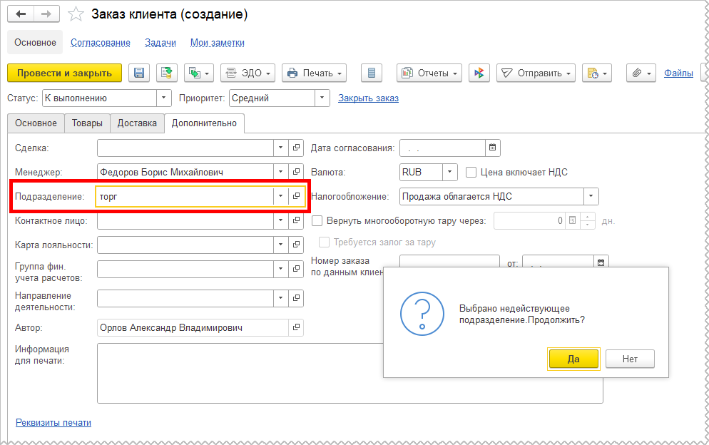 В случае ввода в строке реквизита Подразделение подразделения со статусом Не действует будет введен вопрос подтверждения выбора по аналогии с выбором помеченного на удаление подразделения.