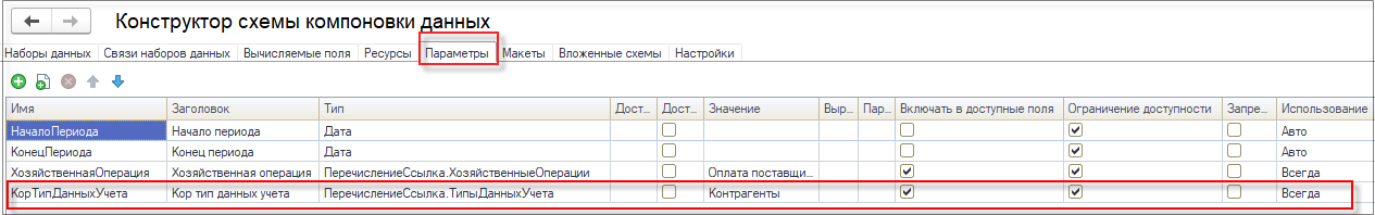 В конструкторе схемы компоновки данных на закладке Параметры необходимо добавить параметр КорТипДанныхУчета. По значению данного параметра отбираются правила для хозяйственной операции документа Заявка на расходование ДС. Для данного документа могут быть выбраны следующие значения: Контрагенты, Денежные средства, Доходы и расходы, Прочие активы и пассивы. Для документа Заявка на командировку можно выбрать только одно значение параметра КорТипДанныхУчета - Денежные средства.