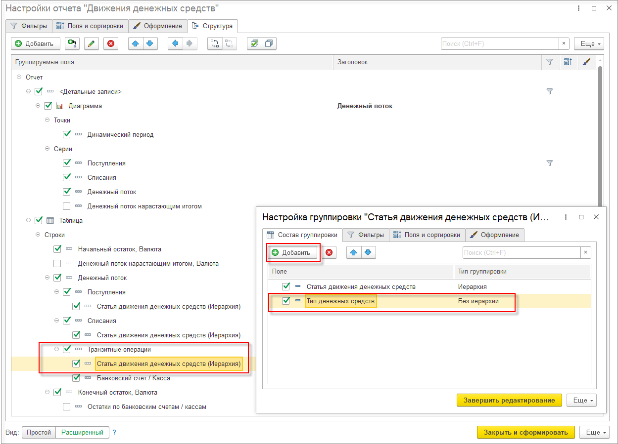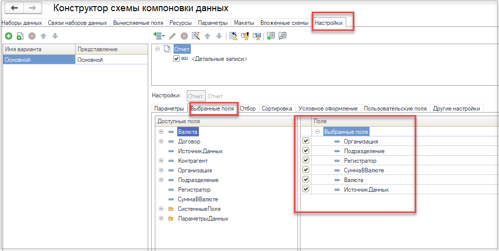 В настройках конструктора схемы компоновки данных необходимо добавить группировку Детальные записи и заполнить список выбранных полей с минимальным количеством обязательных шести полей: Организация, Подразделение, Регистратор, Валюта, ИсточникДанных, СуммаВВалюте. А также добавить все поля, которые включены в дополнительный отбор и настройку заполнения аналитик данного правила получения фактических данных.