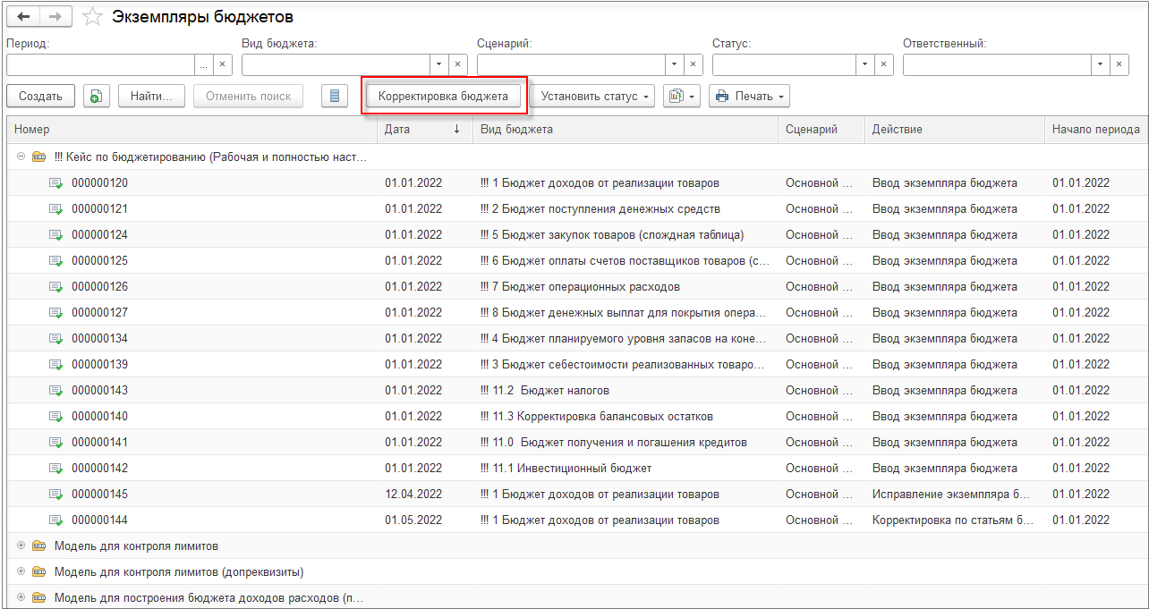 Для корректировки и исправления бюджета необходимо из списка документов Экземпляры бюджетов (см. раздел Бюджетирование и планирование – Бюджеты) выбрать документ для корректировки и ввести на его основании новый документ Экземпляр бюджета с помощью кнопки Корректировка бюджета.