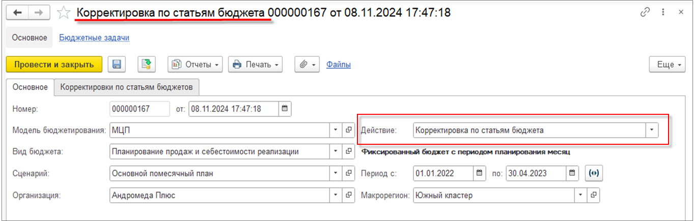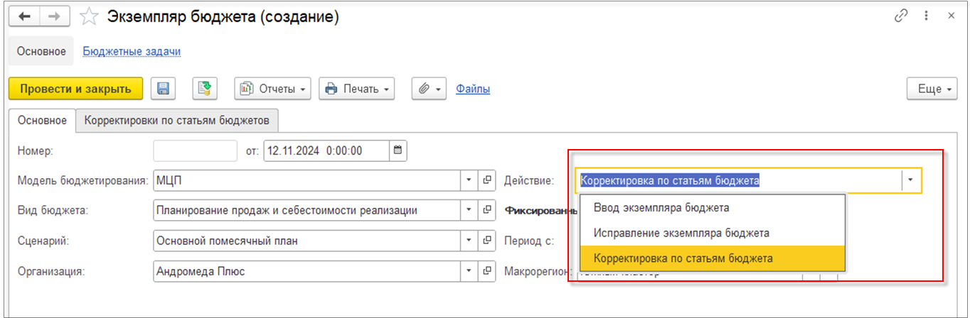 По умолчанию в поле Действие устанавливается значение Корректировка по статьям бюджета, но при необходимости можно выбрать Исправление экземпляра бюджета.