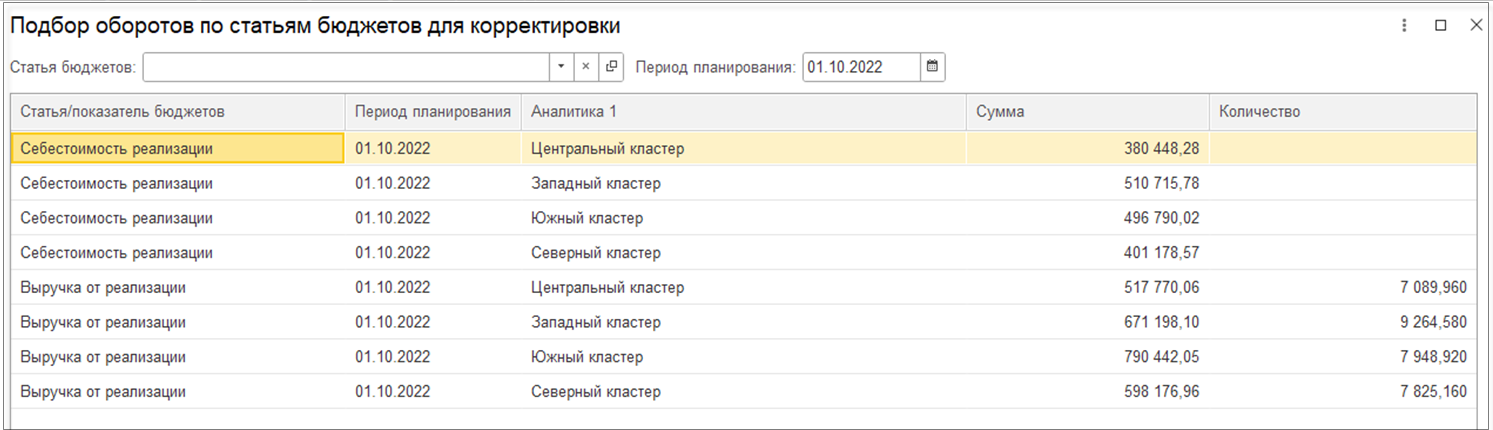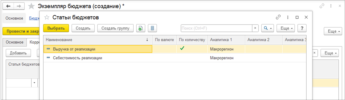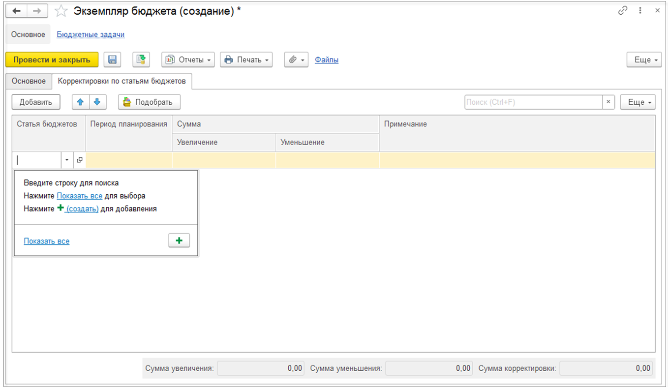 Для выбора доступны только те статьи бюджетов, которые входят в состав корректируемого бюджета.