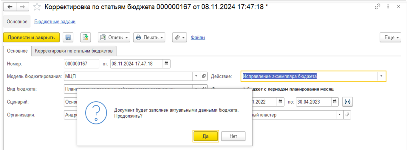 ■ с значения Корректировка по статьям бюджета на значение Исправление экземпляра бюджета с последующим подтверждением заполнения документа актуальными данными из регистра накопления «Обороты бюджетов»;