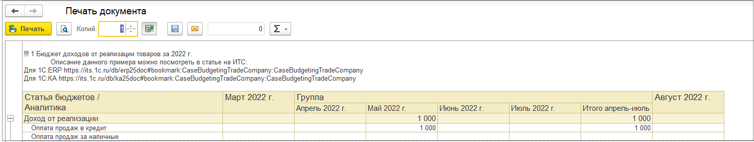 Печатные формы бюджетов для исправления экземпляра бюджета выводят актуальные данные бюджета в соответствии с текущим исправлением.
