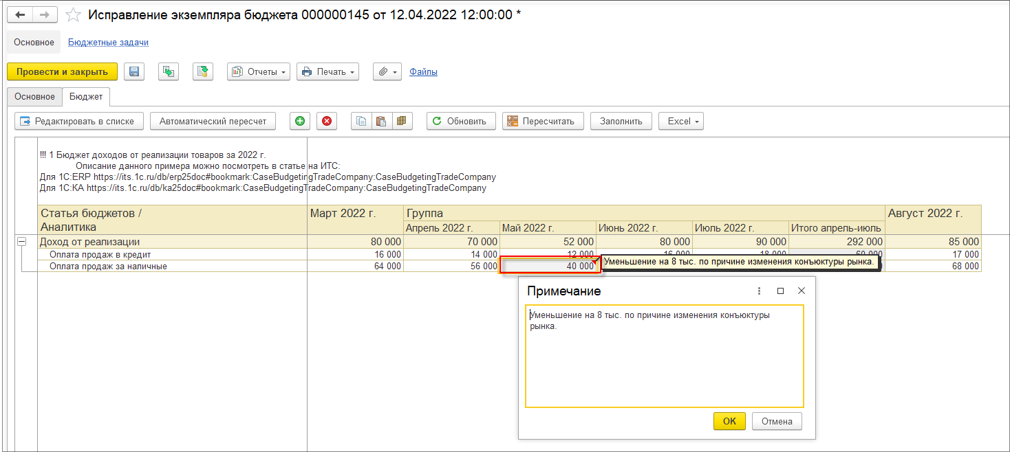 Действие Исправление экземпляра бюджета предполагает ввод новых значений: суммы, количества - по всем статьям бюджета, по такому же алгоритму, как и ввод изначального экземпляра бюджета. Для каждого исправляемого значения можно указать примечание (щелкнув правой клавишей мышки по нужно ячейки в экземпляре бюджета), например, причину корректировки.