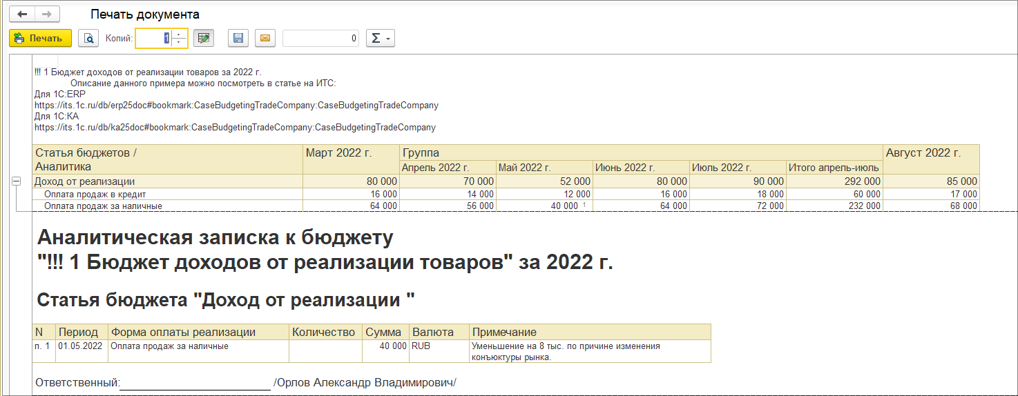 Для исправительного экземпляра бюджета выводятся актуальные значения суммы и количества по всем статьям бюджета. В аналитической записке выводятся примечания по указанным причинам корректировки.