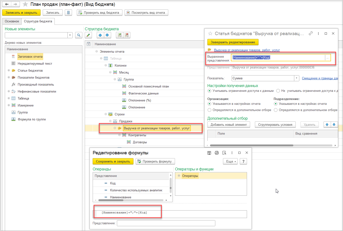 Для вида бюджетов с вводом плановых данных на форме настройки статьи бюджетов добавлено поле Выражение представления. Если оно задано, то представление статьи бюджетов формируется автоматически и недоступно для редактирования.