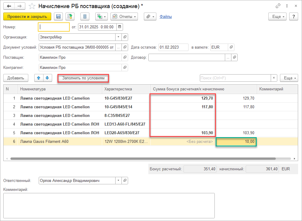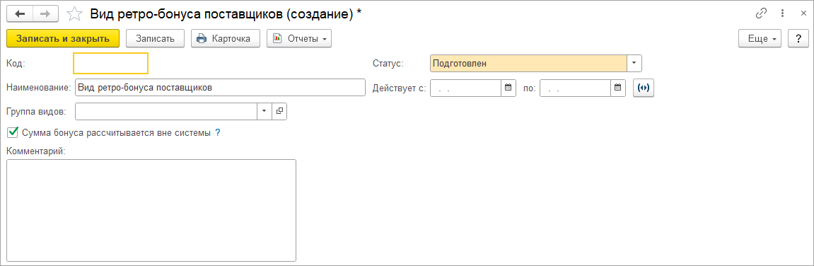 ■ указаны суммой в случае их расчёта вне системы. Сумма начисляемого бонуса задается в документе Условия ретро-бонусов поставщика.