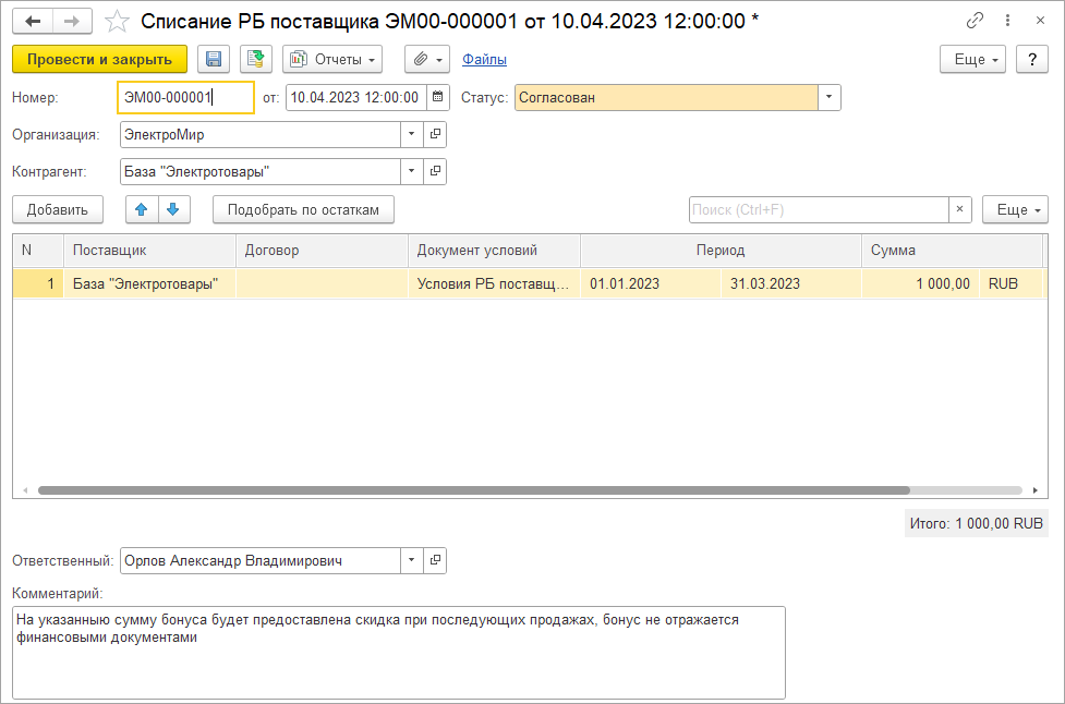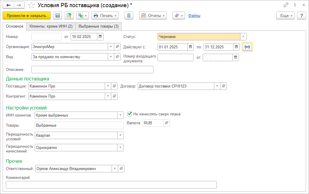 ■ Документ Условия ретро-бонусов поставщика - настройка конкретных условий бонуса от определенного поставщика на определенный период.