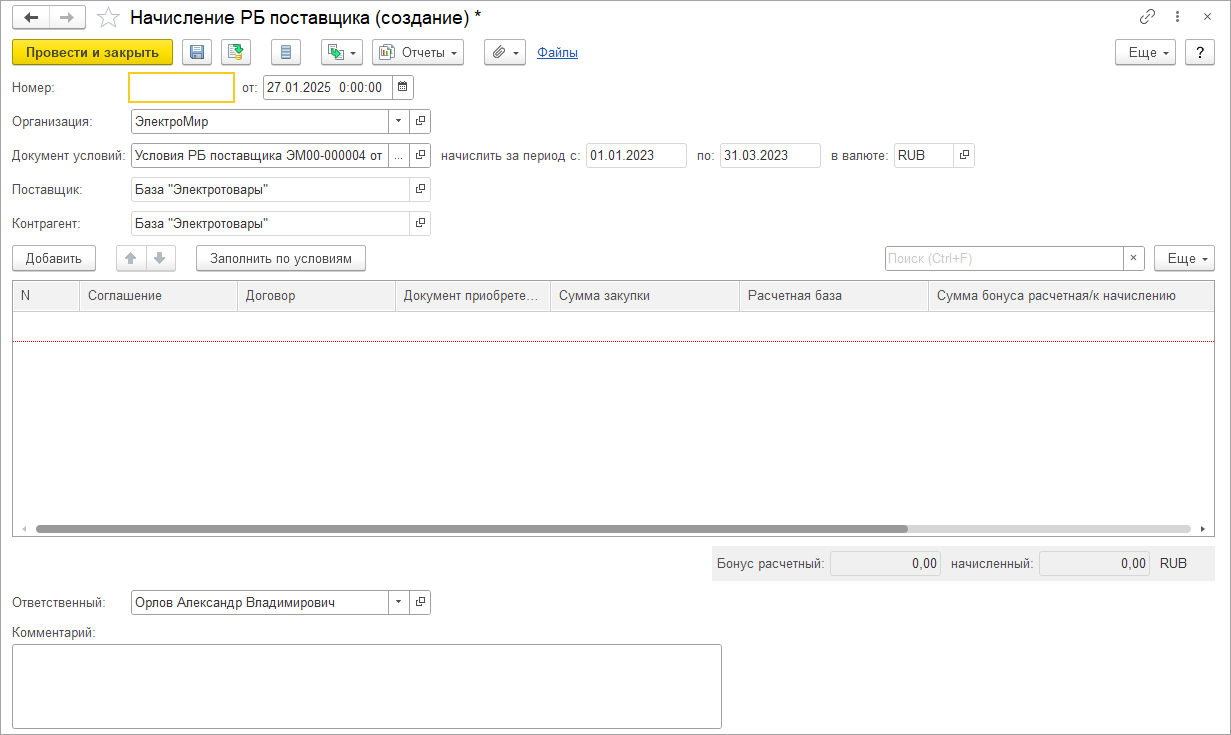 ■ Условия ретро-бонусов поставщика известны: необходимо зафиксировать настройки ретро-бонуса, произвести расчёт и при необходимости зафиксировать начисление бонусов.