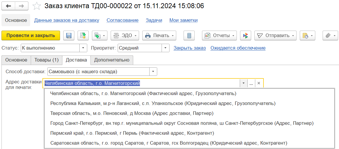 ■ В зависимости от выбранного способа отгрузки / доставки далее указывается точный Адрес или выбирается пункт выдачи или постамат из классификатора СДЭК: