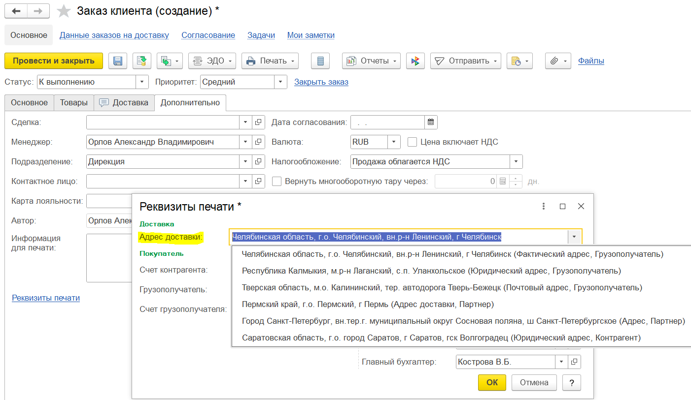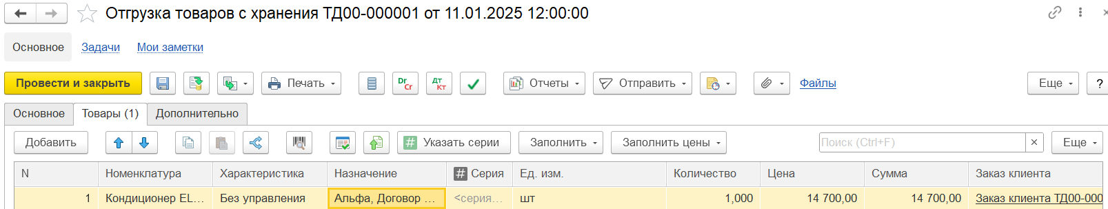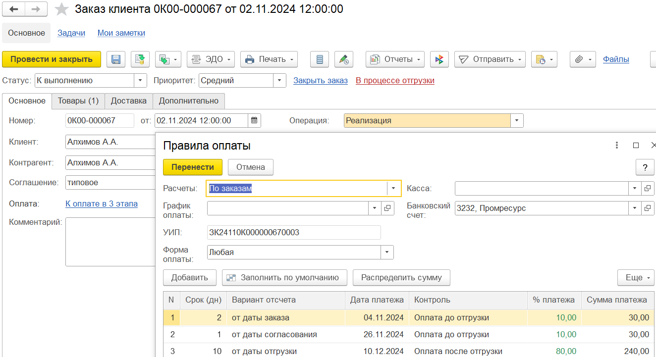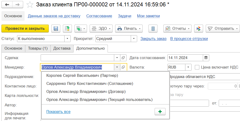 На закладке Основное вводятся основные реквизиты заказа:
