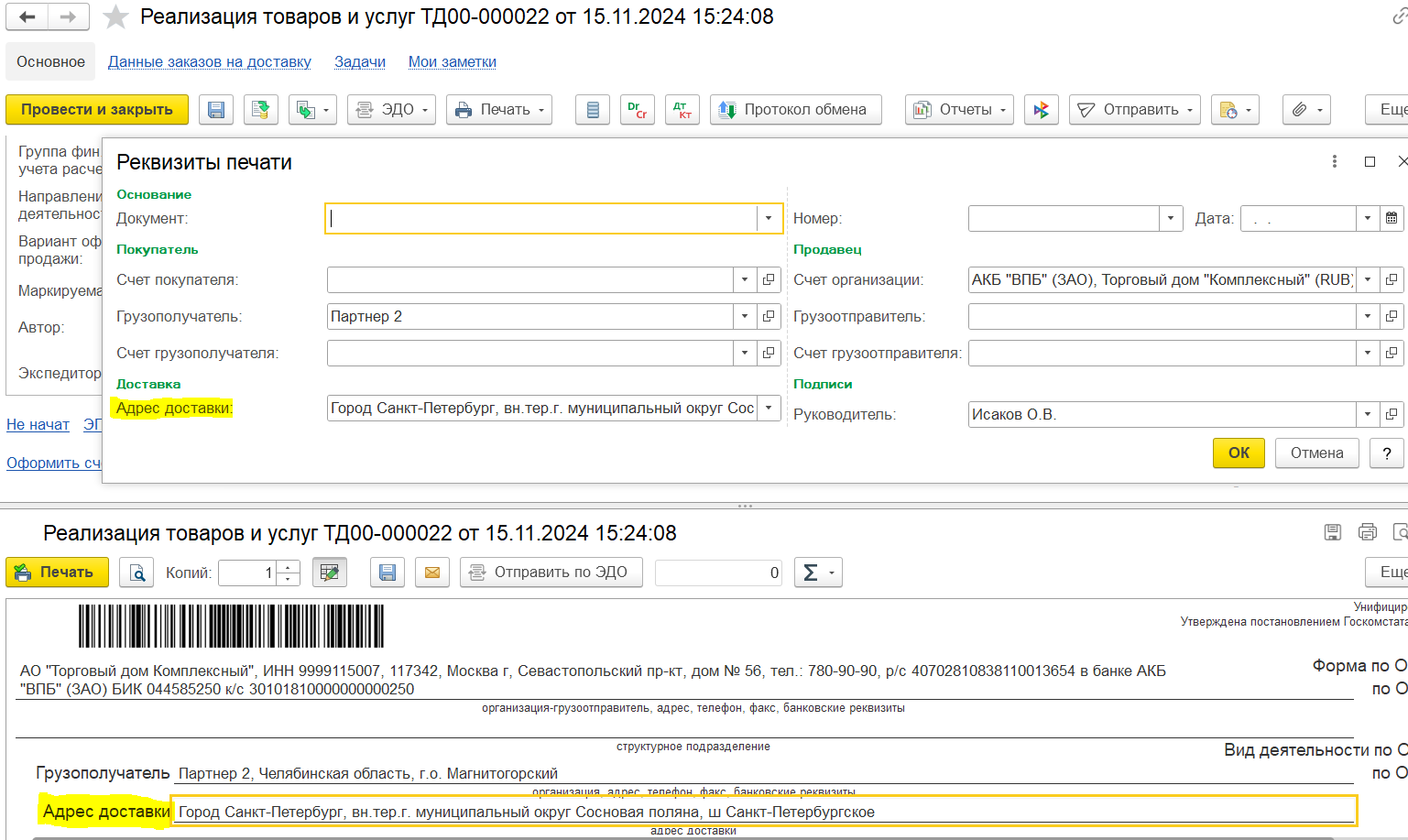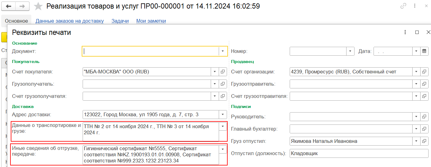 ■ Основания - документ или несколько документов информационной базы, по которым выполняется доставка.