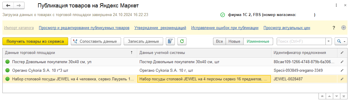 На втором шаге выполняется сопоставление номенклатуры. Если сопоставление номенклатуры в настройках интеграции с торговой площадки завершено не в полном объеме или учетная запись не является объектом интеграций (не Ozon и не Яндекс Маркет), требуется сопоставить полученные сведения с учетной системой стандартными механизмами БЭД.