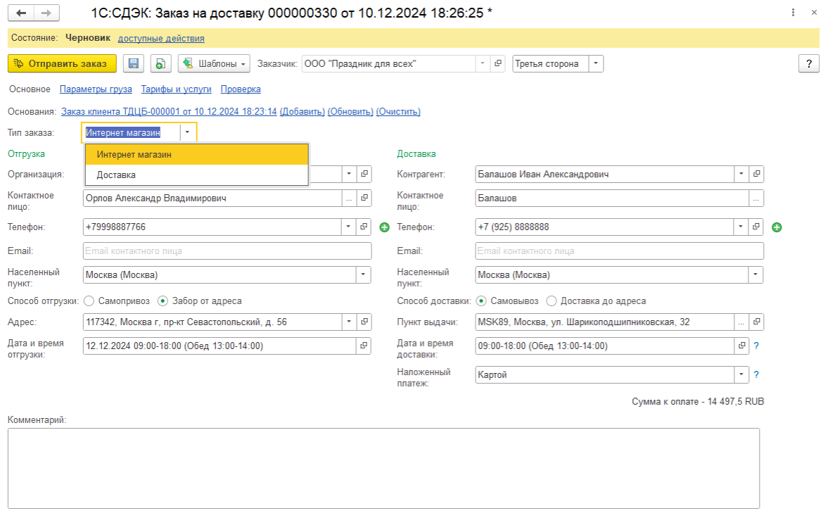 ● Интернет-магазин (по умолчанию) - расширенный вариант доставки. Для этого варианта обязательно указание всех вложений (товары с артикулами), страхование груза. Есть возможность использовать наложенный платеж. Заказ данного типа оформляется только с указанием документов-оснований, из которых будет браться стоимость и все информация по товарам.