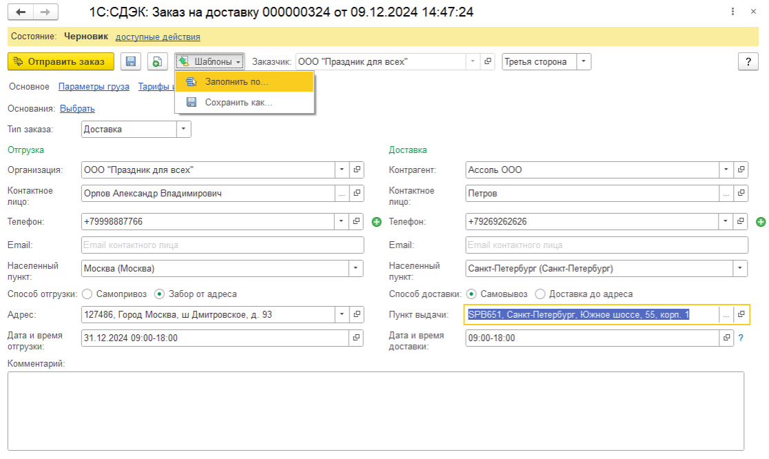 Возможность заполнения по шаблону доступна также для уже созданного заказа на доставку в состоянии Черновик по команде Шаблоны – Заполнить по… в форме заказа.
