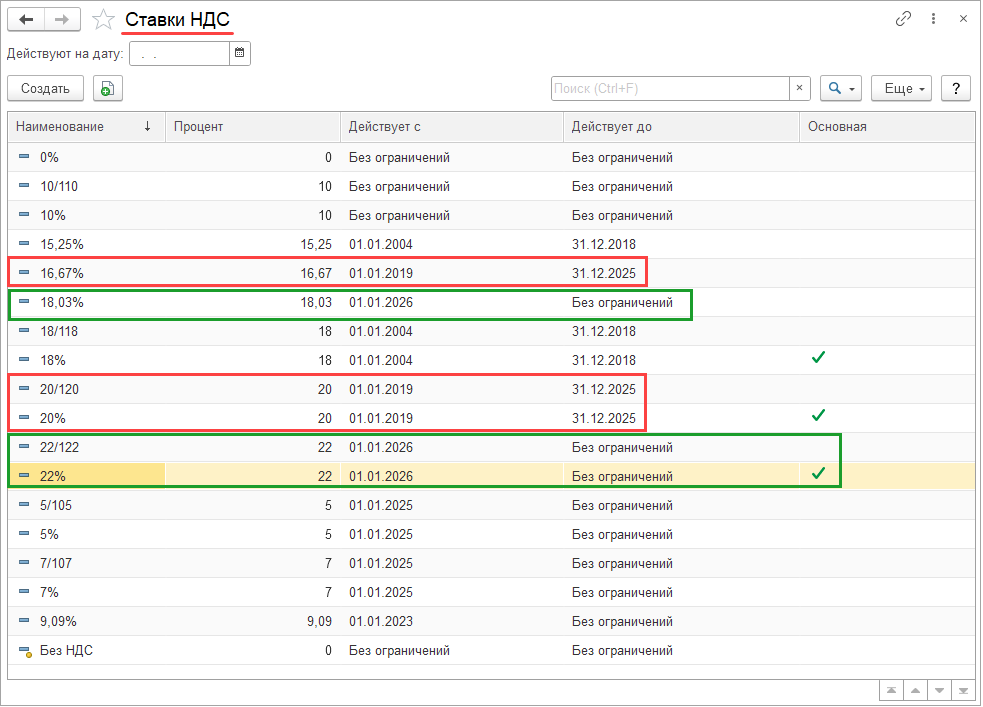 В перечне ставок НДС (поставляется и обновляется в рамках типового решения):