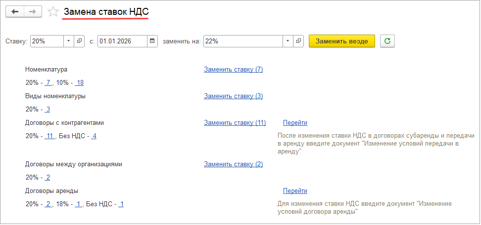 В рабочем месте Замена ставок НДС: