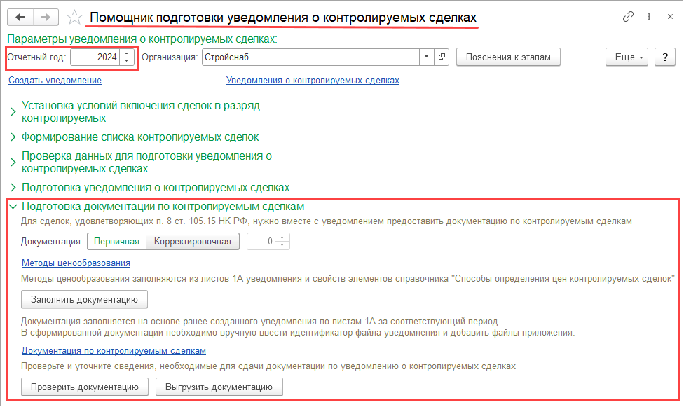 В рабочее место Помощник подготовки уведомления о контролируемых сделках добавлен этап Подготовка документации по контролируемым сделкам. Этап доступен, начиная с отчетности за 2024 год.