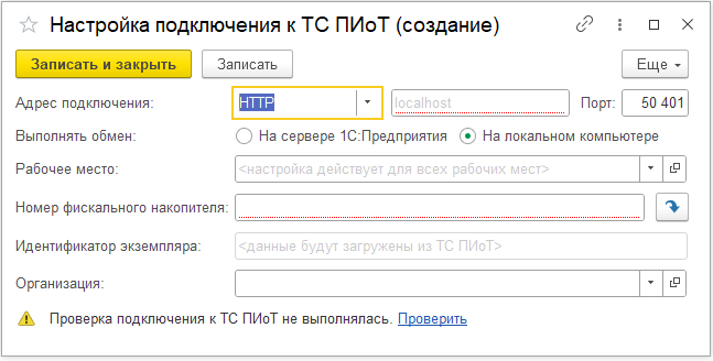 Настройка подключения к ТС ПИоТ привязана к кассе. При указании параметров подключения автоматически запускается получение данных подключенной к ТС ПИоТ кассы. ТС ПИоТ может быть настроен как на клиенте, так и на сервере. Рабочее место позволяет разграничить доступ сотрудников к чужим настройкам.