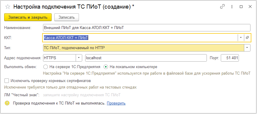 Поддерживается ТС ПИоТ, подключаемый по HTTP. Для настройки нужно указать протокол, адрес подключения и порт. Эти данные должны соответствовать настройкам внешнего ПО ТС ПИоТ. Обмен с ТС ПИоТ, подключаемым по HTTP может производиться на локальном компьютере или на сервере 1С:Предприятие (доступно в клиент-серверной архитектуре).
