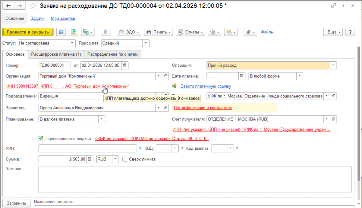 Особенности заполнения реквизитов плательщика в документах Заявка на расходование ДС и Списание безналичных: