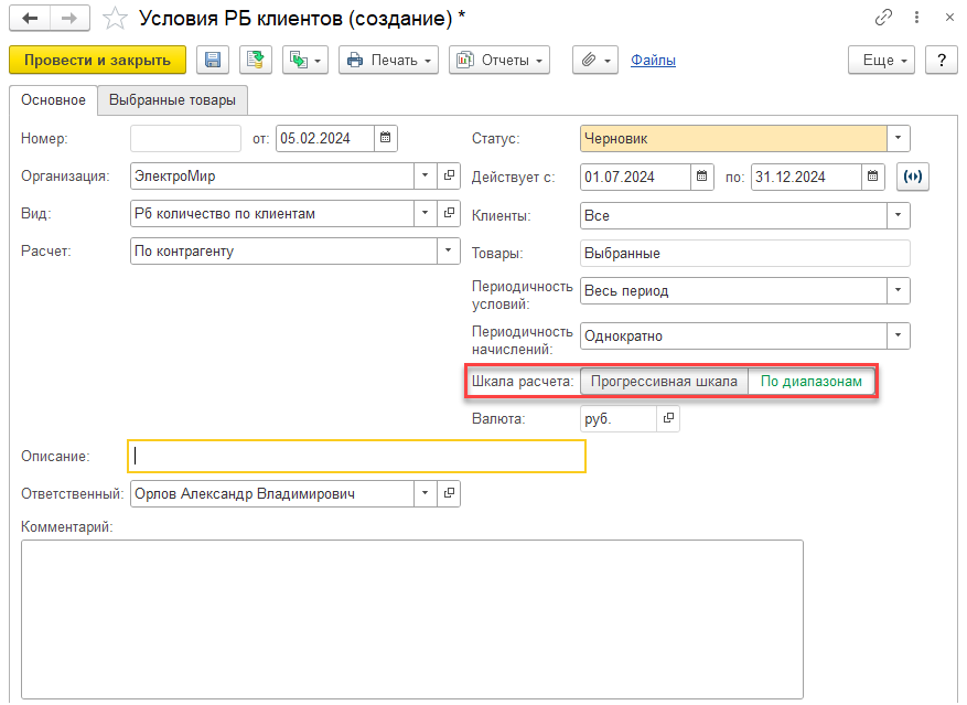 Проверка выполнения клиентом условий продаж осуществляется отдельно для каждой позиции в каждом периоде расчета и зависит от настройки Шкала расчета в документе условий:
