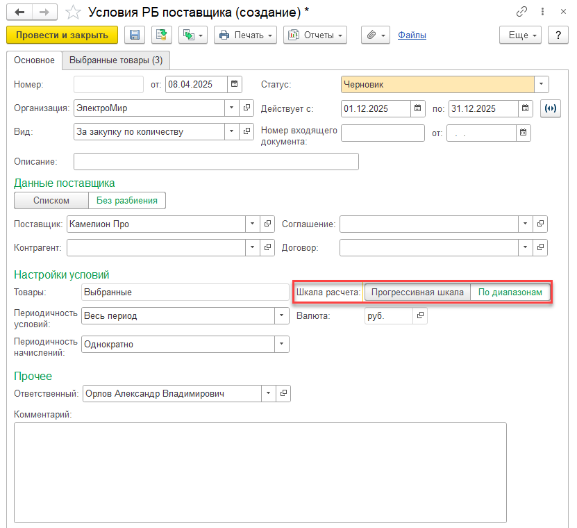 Проверка выполнения условий закупки осуществляется отдельно для каждой позиции в каждом периоде расчета и зависит от настройки Шкала расчета в документе условий: