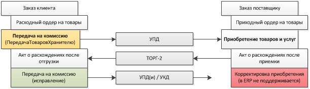 Для фиксации, согласования и отработки расхождений, выявленных после передачи товаров от комитента комиссионеру, предназначен документ Акт о расхождениях после передачи с типом операции Передача на комиссию.