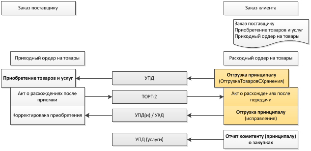 Оформление агентской закупки в общем виде подробно описано в разделе «Закупка товаров через комиссионера при наличии авансов (позиция комитента/принципала)» документации.