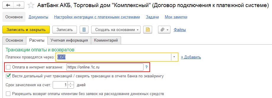 Оплата через интернет может осуществляться с использованием договоров подключения к платежным системам с настройками Платежи проводятся через: Интернет-эквайринг, а также Платежи проводятся через: СБП. Для таких договоров подключения к платежным системам на закладке Расчеты предусмотрен флаг Оплата в интернет магазине, а также поле для указания адреса сайта расчета.