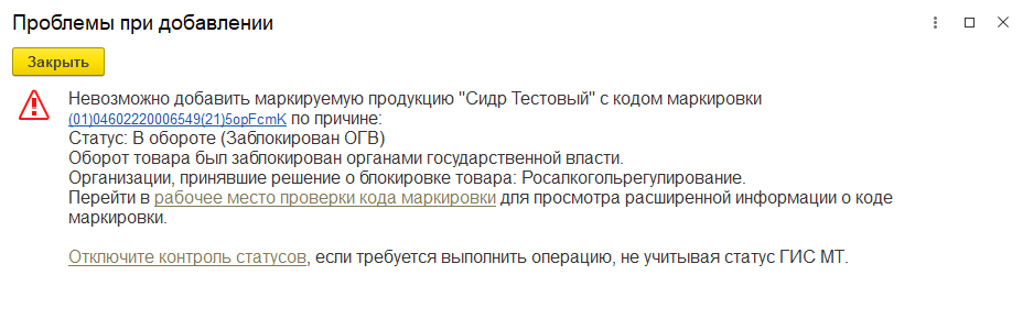Указание кодов не прошедших контроль РД при отгрузке или приемке маркируемой продукции после наступления даты обязательно проверки РД не допускается. При попытке добавления кода маркировки в форме Подбор и проверка… будет выведено предупреждение о некорректном результате проверки РД, если наступила дата контроля РД по товарной группе