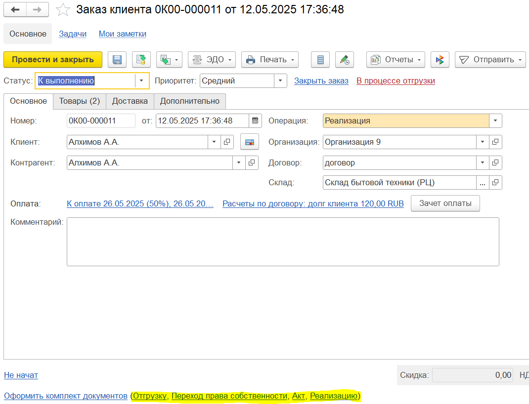 Для регистрации договоренностей с клиентом о поставке товаров предназначен документ Заказ клиента с операцией Реализация, который является распоряжением на отгрузку, первым документом в цепочке и объединяющим документом по сделке.