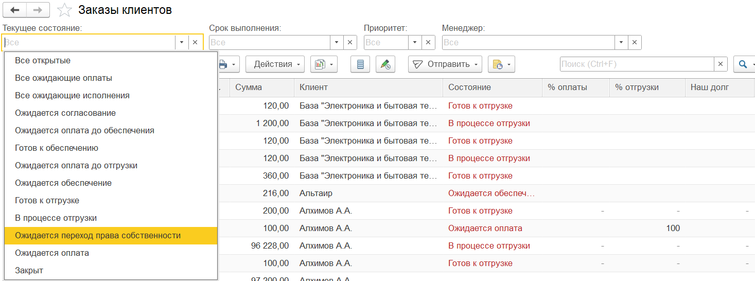 В списке заказов клиентов можно отобрать заказы с текущим состоянием Ожидается переход права собственности.