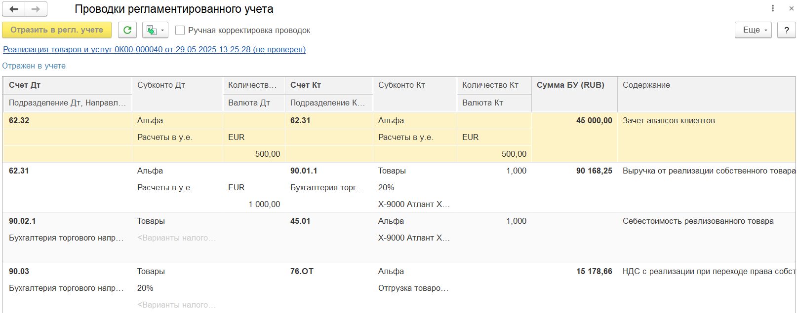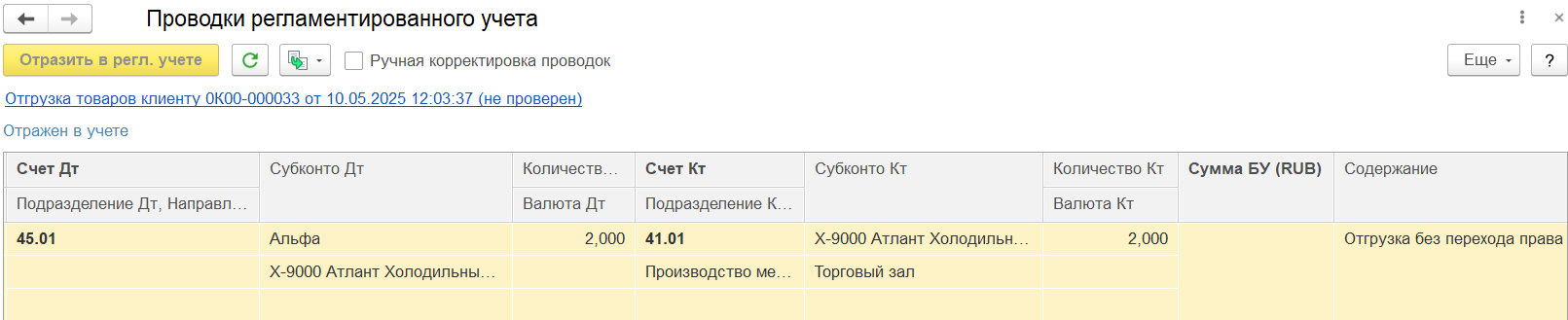 По результату проведения и отражения документа отгрузки товаров клиенту в регламентированном учете формируется проводка: