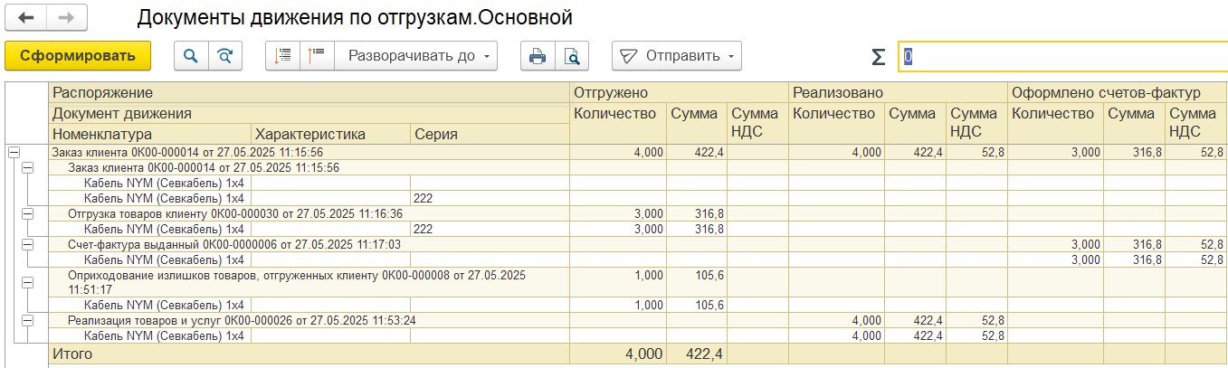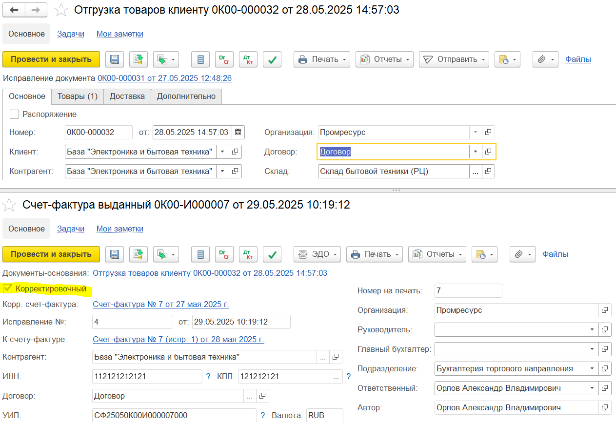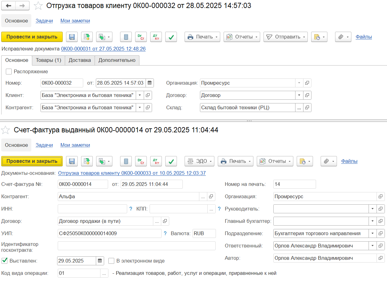 Если исходный счет-фактура по отгрузке не был выставлен, то заказ и отгрузки не по заказу не отображаются в рабочем месте независимо от наличия оформленных документов исправления отгрузки, поступления, списания, оприходования, корректировки.