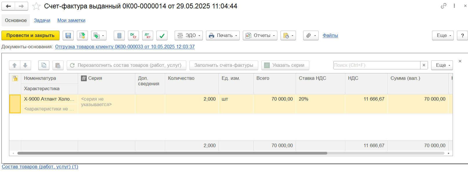 Начисление НДС в момент отгрузки товаров клиенту и вычет НДС с авансов выполняется с использованием документа Счет-фактура выданный. Счет-фактура оформляется:
