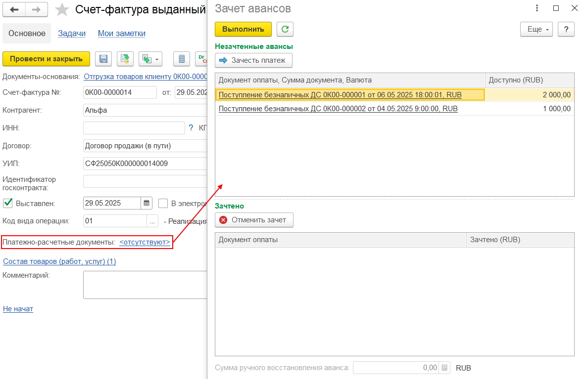 Список авансов, которые можно зачесть до перехода права собственности, и/или, которые уже зачтены по счету-фактуре, отображается в форме Зачет авансов, доступной по гиперссылке реквизита Платежно-расчетные документы на форме счета-фактуры.