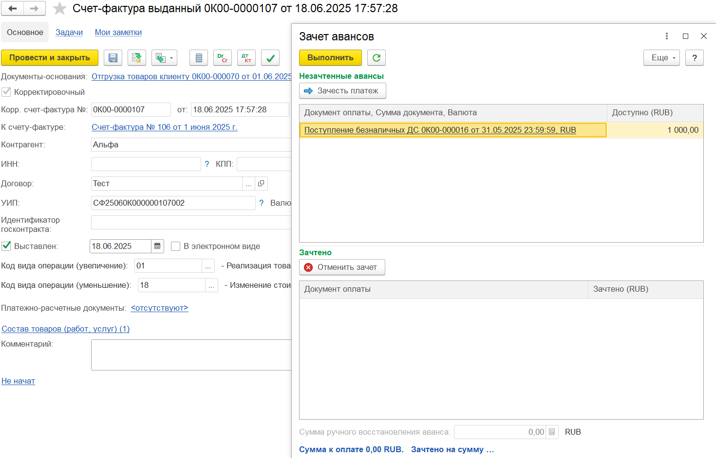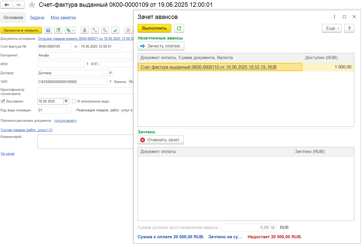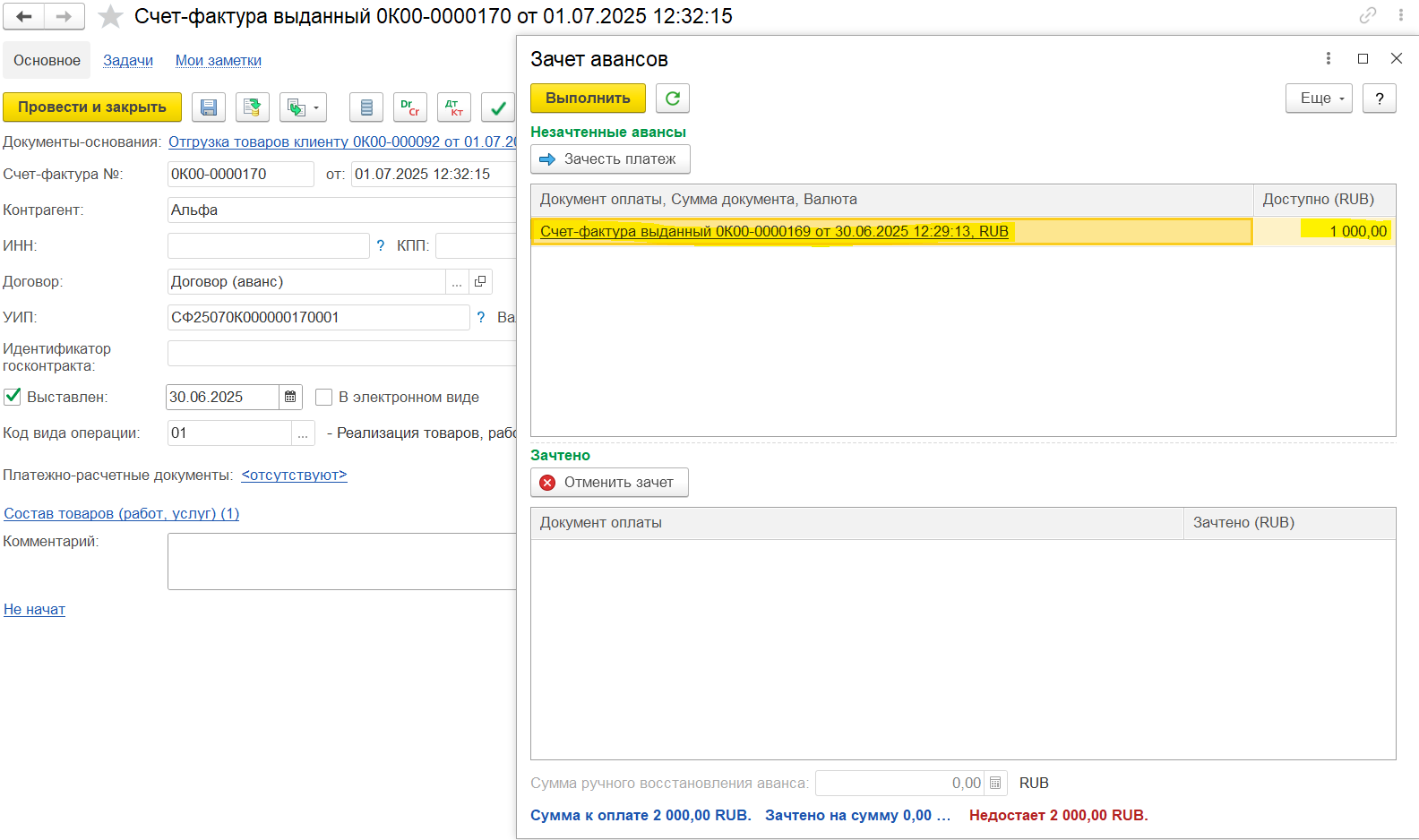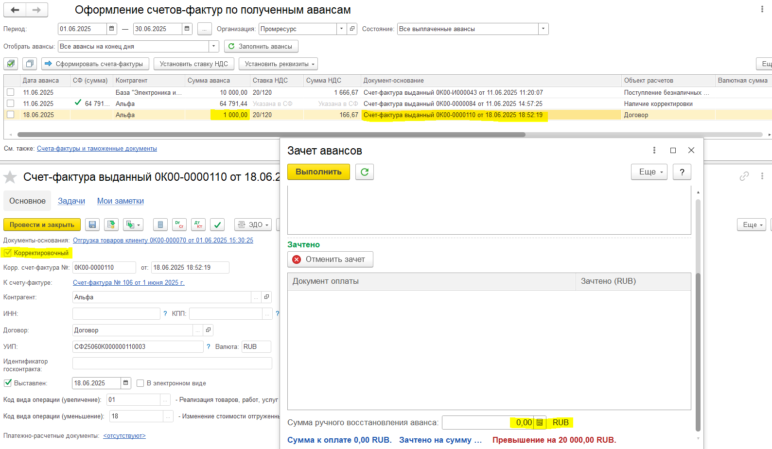Например, аванс 450 000, зачтено в счете-фактуре 100 000, доступно для зачета в следующих счетах-фактурах будет 350 000. Если аванс уже был зачтен в счете-фактуре, то этот аванс не отображается для зачета.