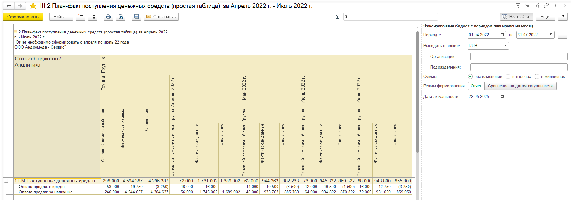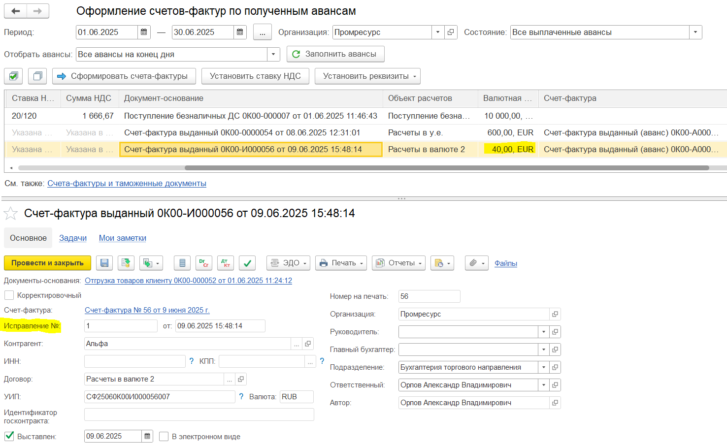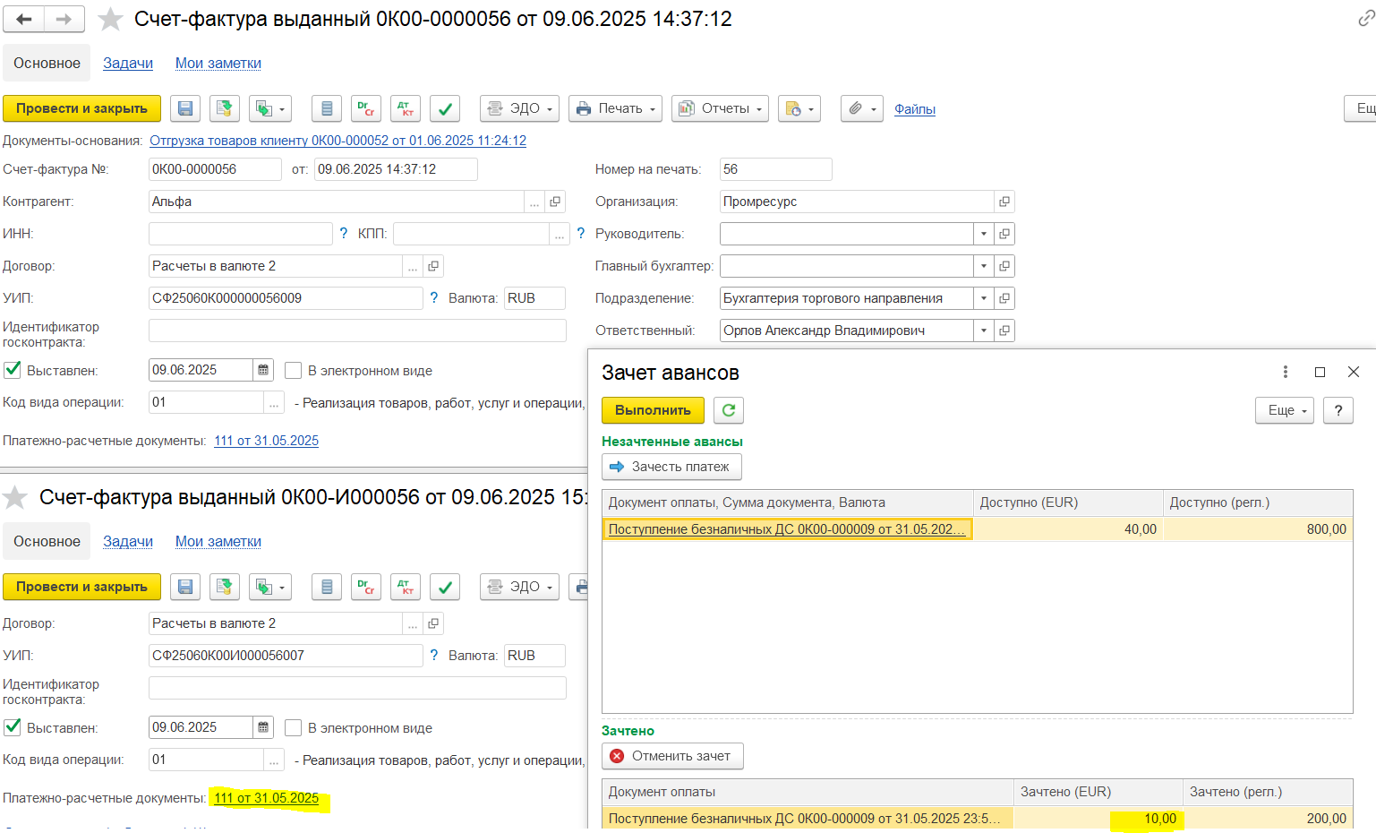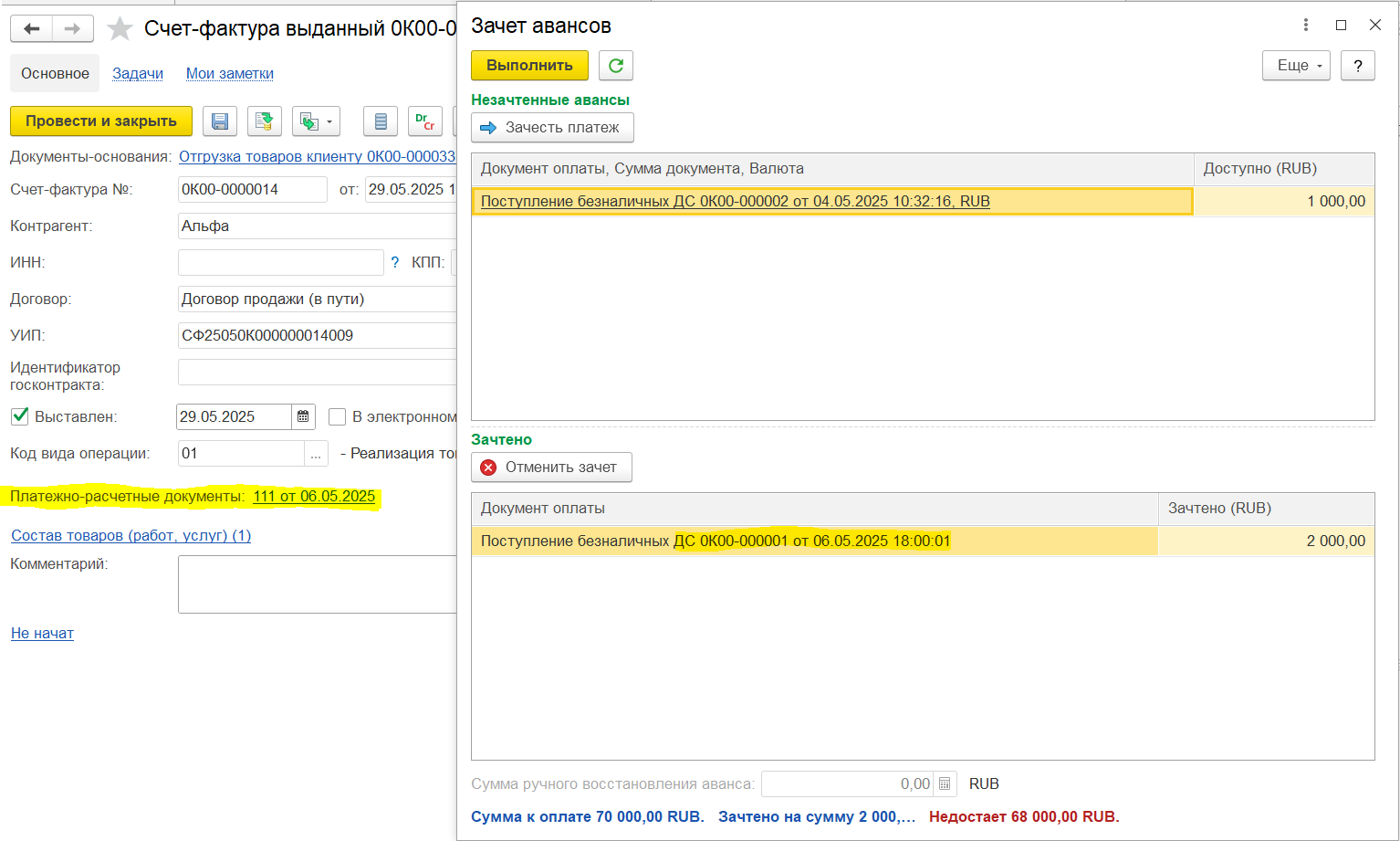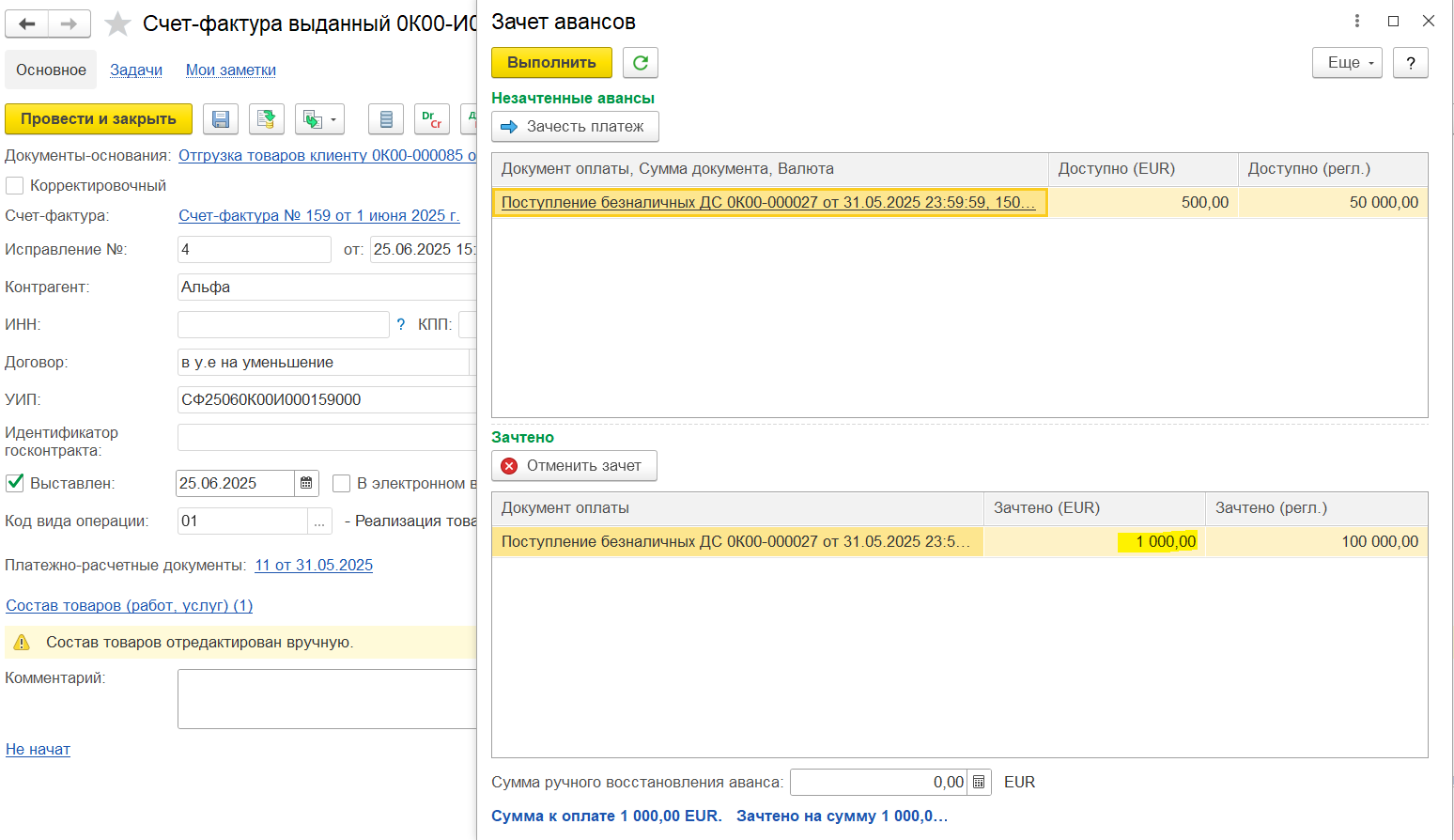 Например, аванс 450 000, зачтено в счете-фактуре 100 000, доступно для зачета в следующих счетах-фактурах будет 350 000. Если аванс уже был зачтен в счете-фактуре, то этот аванс не отображается для зачета.