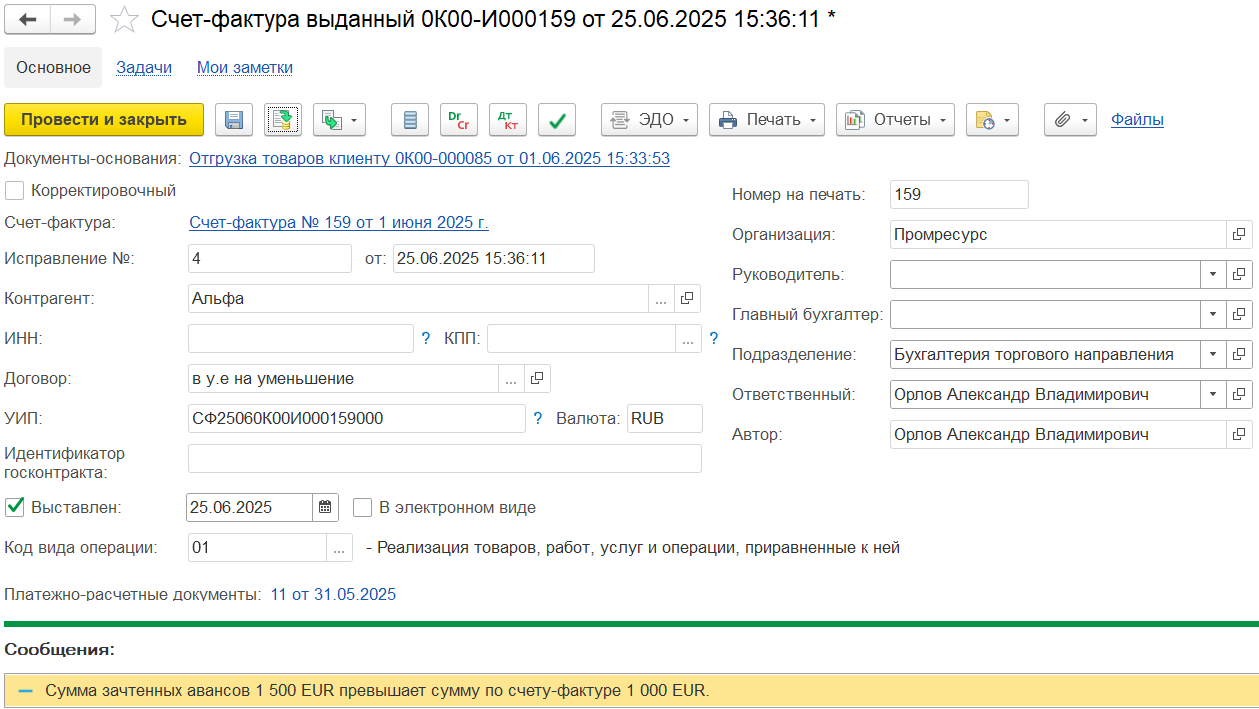 В случае восстановления аванса корректировкой реализации на уменьшение, при проведении ИСФ (оформленной по такой корректировке) выходит информационное сообщение типа: «Сумма зачтенных авансов превышает сумму по счету-фактуре».