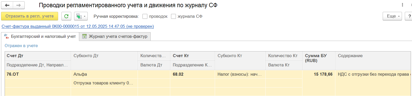 По результату проведения и отражения документа СФ выданный в регламентированном учете формируется проводка: