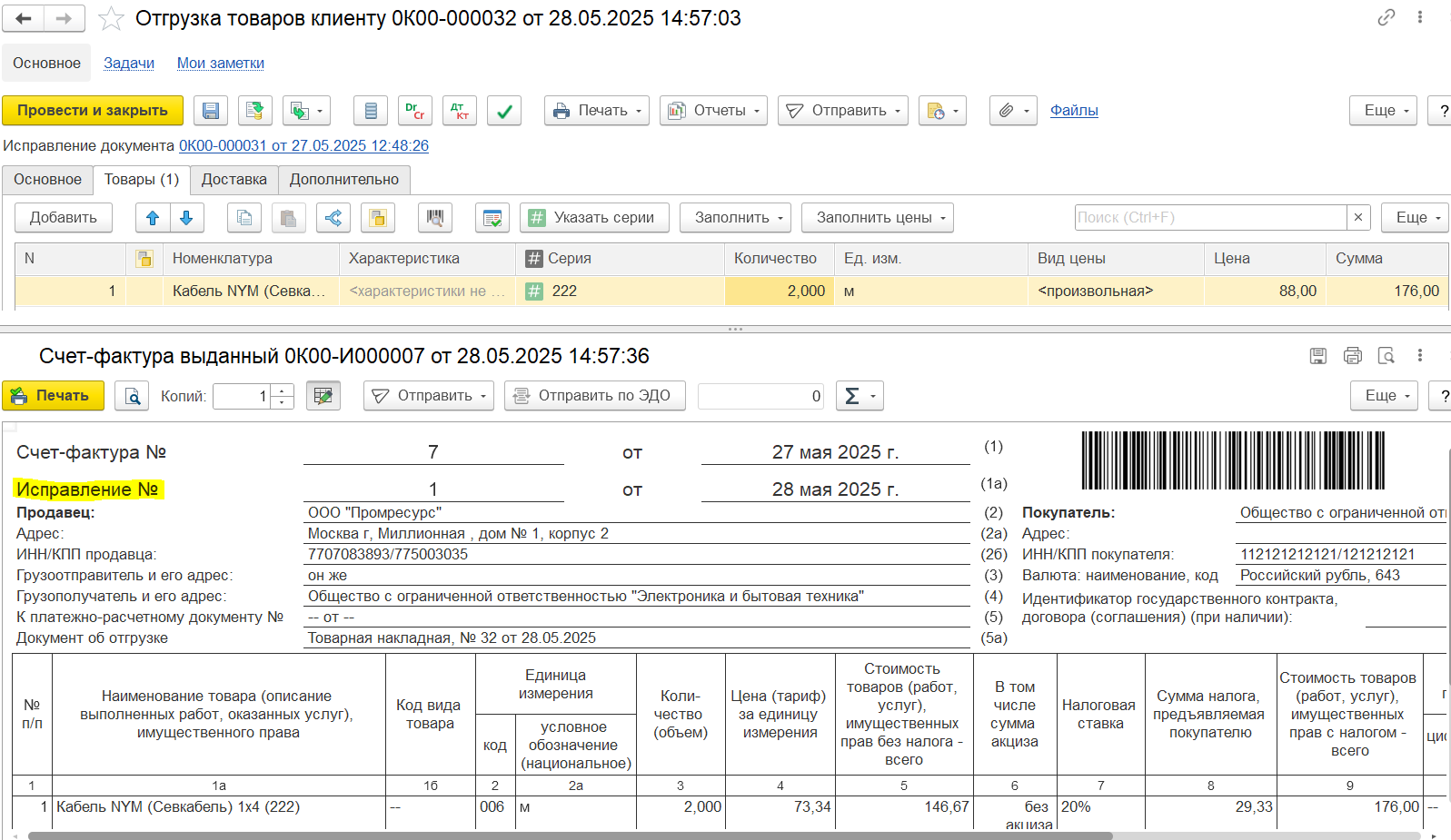 Табличная часть «Товары» в ИСФ будет заполнена по данным исправленной отгрузки.